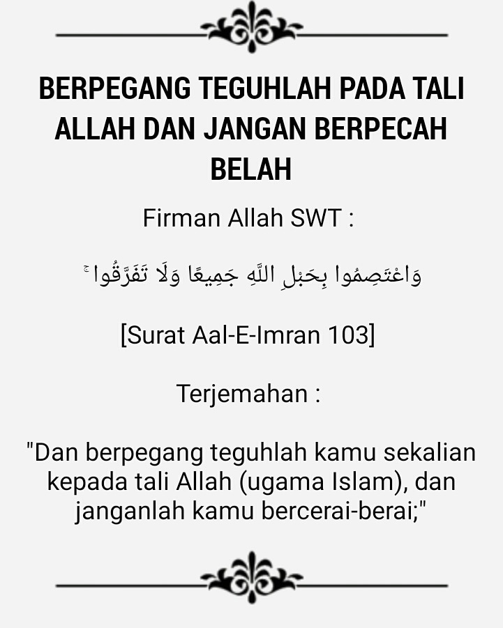 { يَٰٓأَيُّهَا ٱلنَّبِيُّ ٱتَّقِ ٱللَّهَ وَلَا تُطِعِ ٱلۡكَٰفِرِينَ وَٱلۡمُنَٰفِقِينَۚ إِنَّ ٱللَّهَ كَانَ عَلِيمًا حَكِيمٗا } [Surah Al-Aḥzāb: 1] Abdullah Muhammad Basmeih: Wahai Nabi! Tetaplah bertaqwa kepada Allah, dan janganlah engkau patuhi kehendak orang-orang kafir dan orang-orang munafik. Sesungguhnya Allah adalah Maha Mengetahui, lagi Maha Bijaksana.
